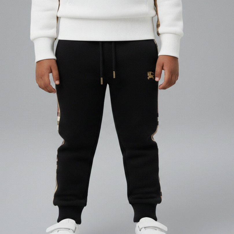 - Matching Jogger Pants: Black joggers with side check stripes and elastic waistband