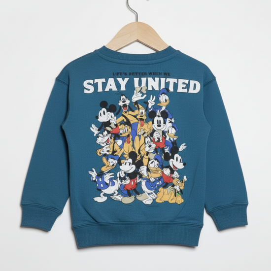 Bring a touch of Disney magic to your child's wardrobe with this fun and cozy graphic sweatshirt. Featuring a vibrant graphic of favorite characters—Mickey Mouse, Donald Duck, Goofy, and Pluto—this sweatshirt carries a positive message with the text "STAY UNITED". The rich teal color adds a stylish touch, while the classic crew neck and long sleeves provide a comfortable and relaxed fit. Perfect for cooler days, this sweatshirt's soft fabric and ribbed cuffs and hem make it a great choice for school, playdates, or just relaxing at home. It’s a great way for little ones to show their love for these timeless characters!