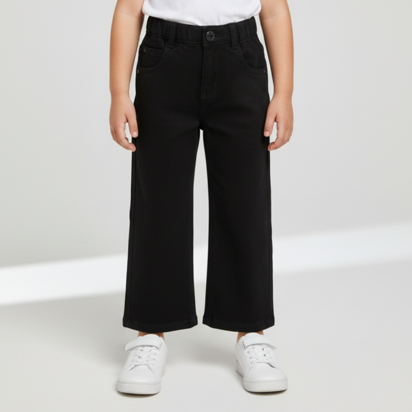 Girls’ Black Cropped Culottes by NINOS combine style and comfort effortlessly. Made from a soft cotton/denim blend, these trousers feature a trendy mid-calf wide-leg silhouette and a full elasticated waistband for easy wear. Versatile black color pairs well with any top, while functional pockets add practicality—perfect for school, outings, or casual occasions.
