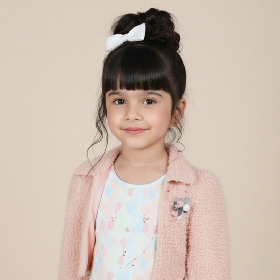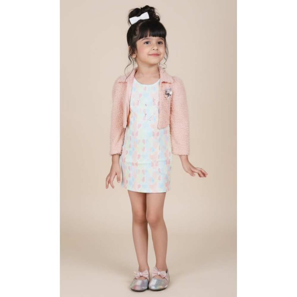 Layered over the dress is a fashionable light pink cropped jacket crafted from cozy textured shaggy or bouclé knit fabric. The jacket adds warmth and style, featuring full sleeves, a structured collar, and a detachable decorative brooch for an extra touch of charm. Perfectly paired with her favorite shimmery shoes and a bow, this set is ideal for birthday parties, spring outings, or any occasion that calls for sweet and stylish comfort.