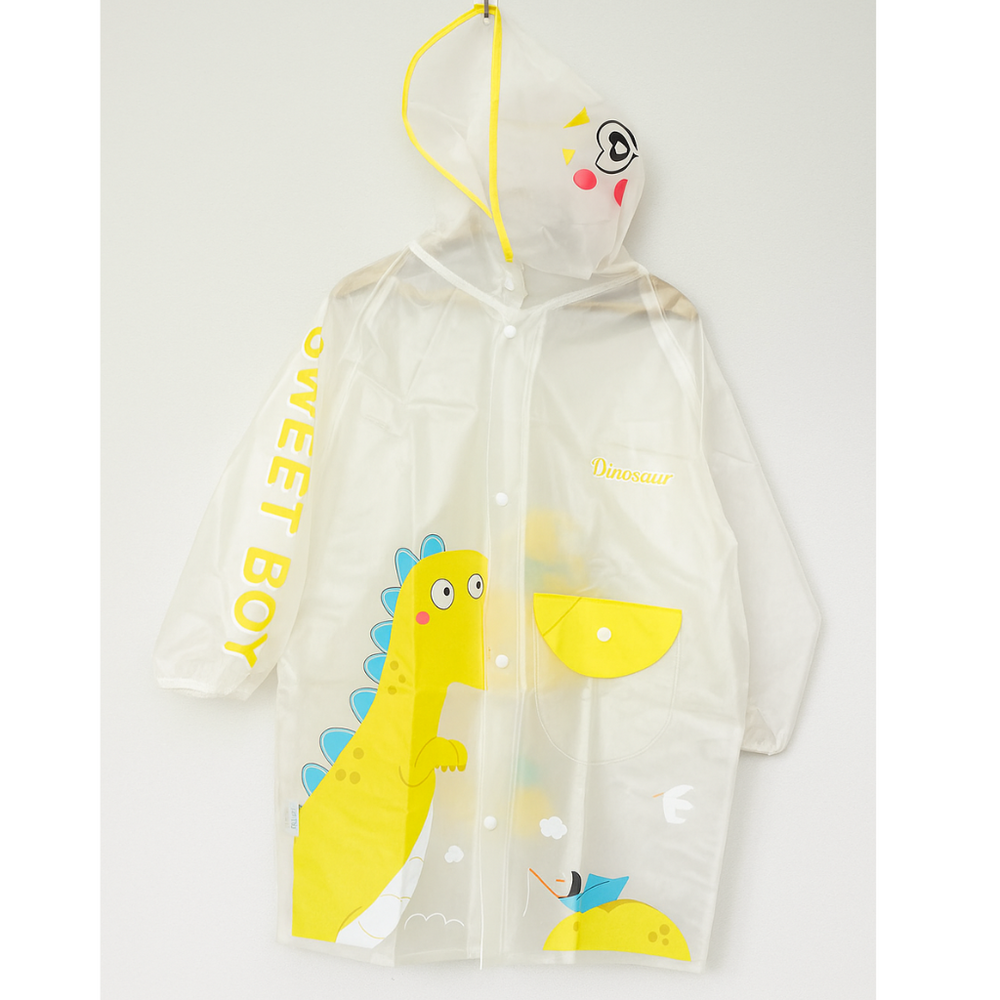 Make rainy days fun with this adorable kids' dinosaur raincoat! Featuring a cheerful yellow dinosaur print and the playful "Sweet Boy" text on the sleeve, this transparent hooded raincoat is both practical and cute. Designed to keep your child dry and smiling, it’s a must-have for every little explorer.