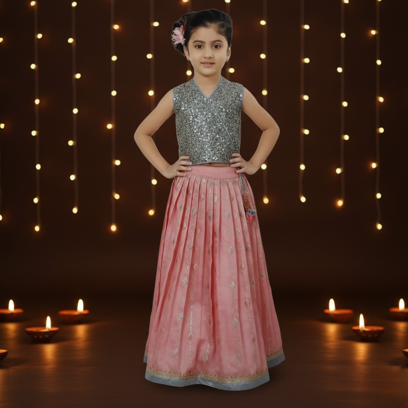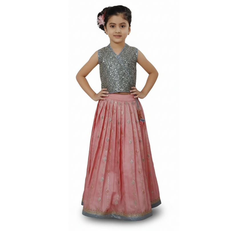 Dress your young fashionista in this dazzling Sequin Crop Top and Dusty Pink Lehenga Set, a perfect ensemble for festive occasions and parties. The sleeveless crop top features a chic wrap-style V-neck and is completely covered in shimmering silver sequins for maximum sparkle. The accompanying lehenga skirt boasts a beautiful dusty pink color, embellished with subtle, all-over metallic foil or print motifs in a geometric pattern. The set is completed with playful tassels and beads at the waist tie-up and a rich contrasting trim at the hem, giving it an elegant, designer finish. Comfortable yet luxurious, this outfit is designed to let your child shine at any celebration.