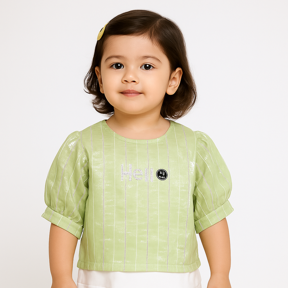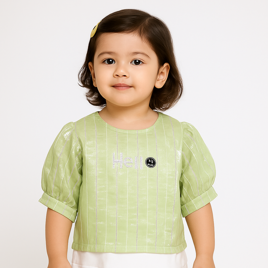 Add sparkle to your little girl’s wardrobe with this eye-catching light green shimmer top by Ninos. Designed with glossy vertical stripes, adorable puffed sleeves, and a fun “Hello 😊” embellishment on the front, this top is perfect for festive events or special outings. The back zip ensures easy wear, while the soft satin hem adds an elegant layered touch. Pair it with skirts, jeggings, or palazzos to complete a standout party look.