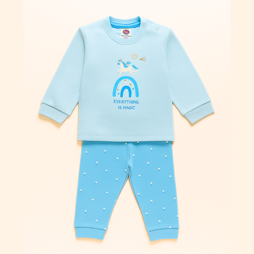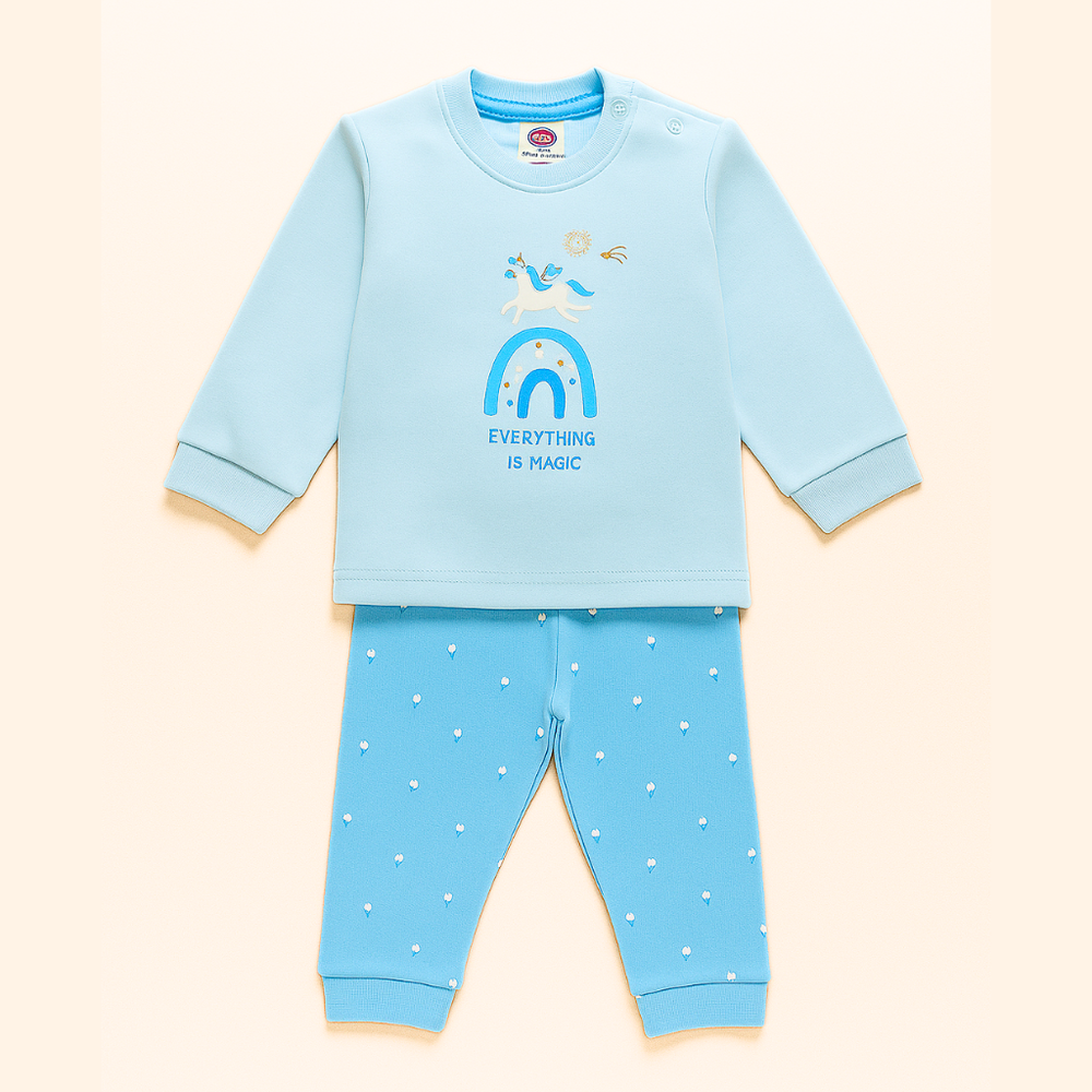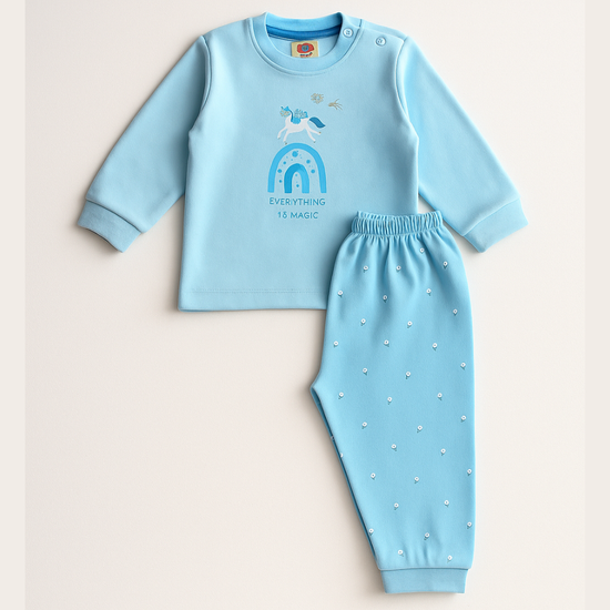 Stylish full-sleeve T-shirt with a charming button detail. Comfortable Fit: Soft, breathable fabric perfect for all-day wear. Versatile Style: Comes with matching pants for a complete look. Easy Dressing: Convenient button closure for quick changes. Playful Design: Ideal for both casual outings and playdates.