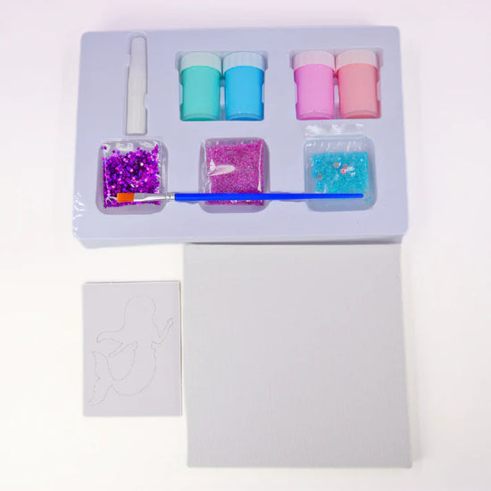 Items included in Packages:- 4 Pouring Paints (Cobalt Blue, Dark Teal, Mazerine Blue, and Cobalt Purple) 20 ML each, 1 Pre-Cut Mermaid Stencil, Glitters (Pink & Blue), Gem Stickers (Pink & Blue), 1 Canvas (15 x 15 cms), White Glue and 1 Paint Brush.