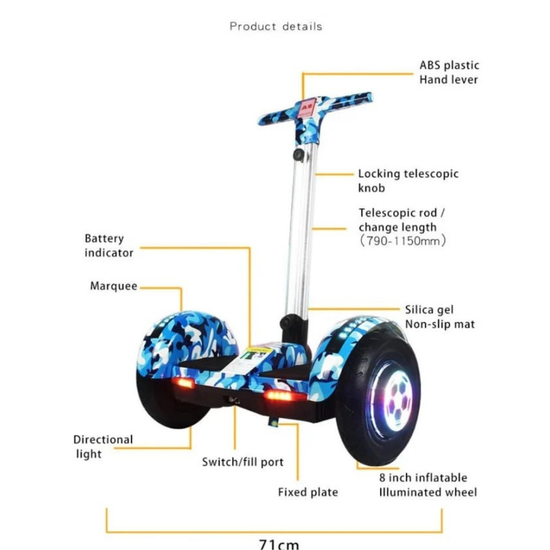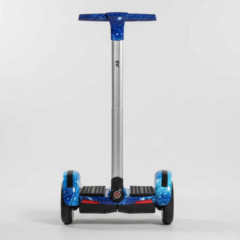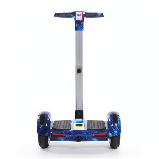 Experience the future of personal mobility with this striking Galaxy Blue Segway-style hoverboard . Featuring an innovative adjustable handlebar that extends from 79-115cm, this self-balancing scooter accommodates riders of varying heights. The advanced A8 Smart chip ensures stable, smooth operation while LED-illuminated wheels and directional lights enhance both style and safety. Built with durable ABS plastic construction, the hoverboard includes an ergonomic handlebar stand that helps reduce knee strain during rides. The 8-inch inflatable wheels provide excellent stability and shock absorption, while the non-slip silica gel mat ensures secure footing. With a maximum speed of 12 km/h and a range of 12 km per charge, this hoverboard is perfect for ages 6-12 years. The device includes thoughtful features like a battery indicator, Bluetooth speaker capability, and a secure locking mechanism for the telescopic handlebar. The striking galaxy blue camouflage pattern adds a cosmic aesthetic to your riding experience. With a 250-watt motor and 36V rechargeable lithium-ion battery that charges in 2.5 hours, this hoverboard combines advanced technology with user-friendly design for an exceptional riding experience.