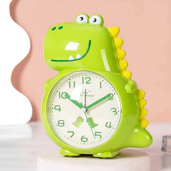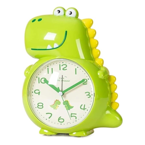 Make learning to tell time fun and exciting with this adorable dinosaur-themed alarm clock! The charming green dinosaur design features a friendly face and playful spikes, perfect for adding character to any child's room. The clear, easy-to-read analogue display has large numbers and distinctive hands that help children master time-telling skills. This clock comes with practical features including a snooze function and night light, making it both functional and child-friendly. The non-ticking mechanism ensures quiet operation for undisturbed sleep. The clock runs on batteries, offering flexibility in placement and setup. Its sturdy construction and delightful design make it an ideal gift for dinosaur enthusiasts and a practical addition to any bedroom