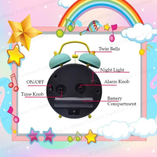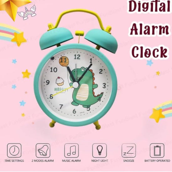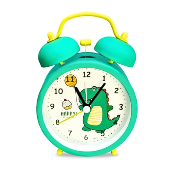 DESIGN FEATURES: Charming dinosaur-themed analog alarm clock with twin bells and turquoise colour frame, perfect for children's bedrooms and study areas