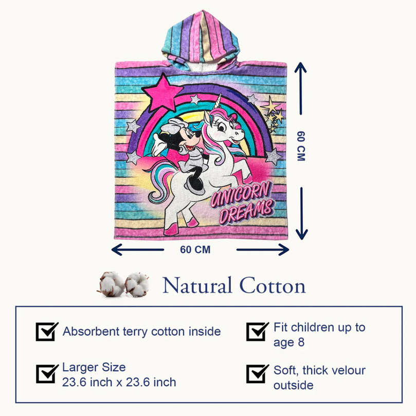 A cozy and absorbent Disney Minnie & Unicorn hooded poncho towel made from 100% cotton. Perfect for bath time, pool, or travel with fun character design and versatile use. A thoughtful gift for kids.