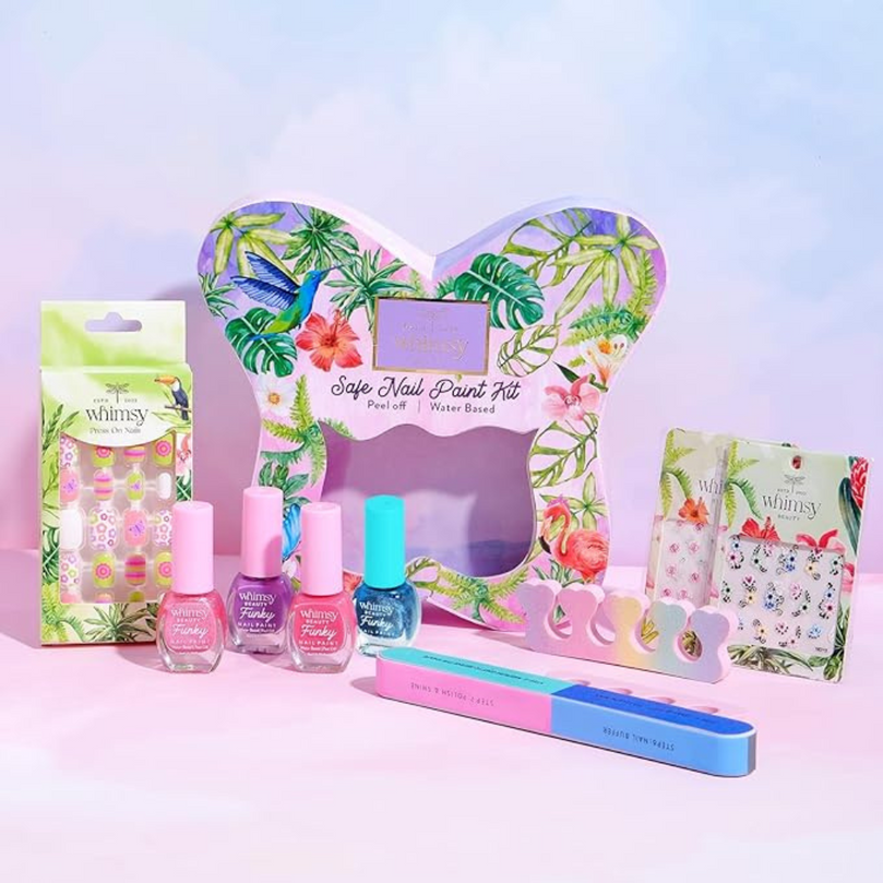 - Press on Nails: Available in a multitude of colors & designs, these nails are pre-glued, super easy to use, long-lasting and reusable! Indulge your princesses in some fun manicure sessions and explore their creative craft with these stick-on nails. Whimsy Stick on nails are free from nasty chemicals and glue making them safe to use and remove easily.